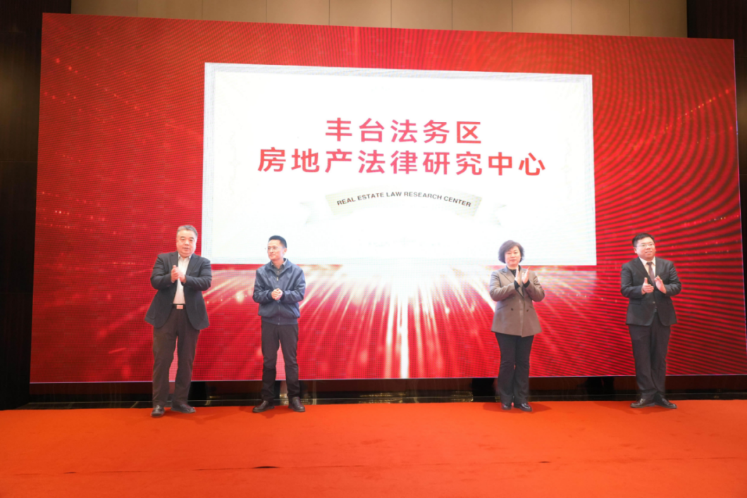 圖為高建忠、曾會洋、孟憲芹、吳少博為豐臺法務區(qū)房地產(chǎn)研究中心揭牌。
