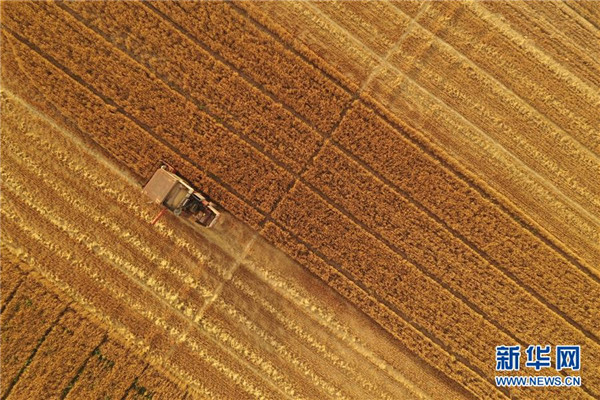 6月13日,雄安新區(qū)大王鎮(zhèn)小王村村民在收獲小麥(無人機拍攝)。 近日,雄安新區(qū)小麥陸續(xù)成熟,當?shù)卮迕駬屪マr(nóng)時進行收獲。 新華社記者 邢廣利 攝
