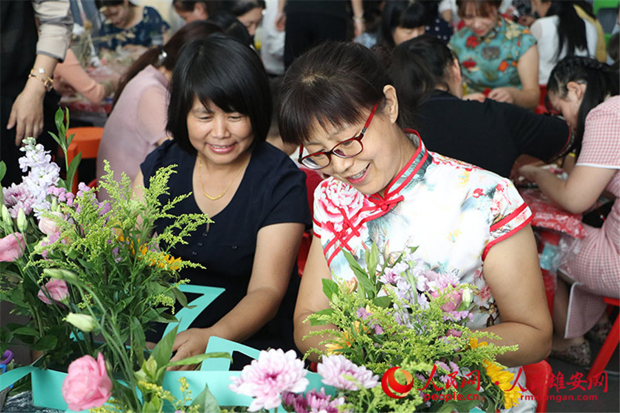 教師節(jié)當(dāng)天,北京市六一幼兒院雄安院區(qū)舉辦“花兒獻祖國,傳承經(jīng)典文化”主題活動,老師和孩子們一起用插花、制作團扇等形式慶祝新中國成立70周年和第35個教師節(jié)。