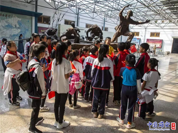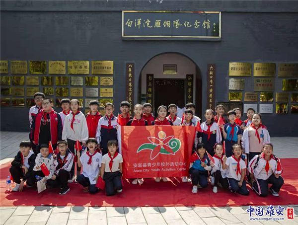 孩子們?cè)诎籽蟮硌泗彡?duì)紀(jì)念館門(mén)口合影留念。中國(guó)雄安官網(wǎng)發(fā)
