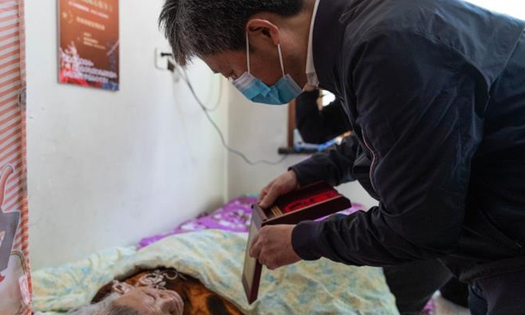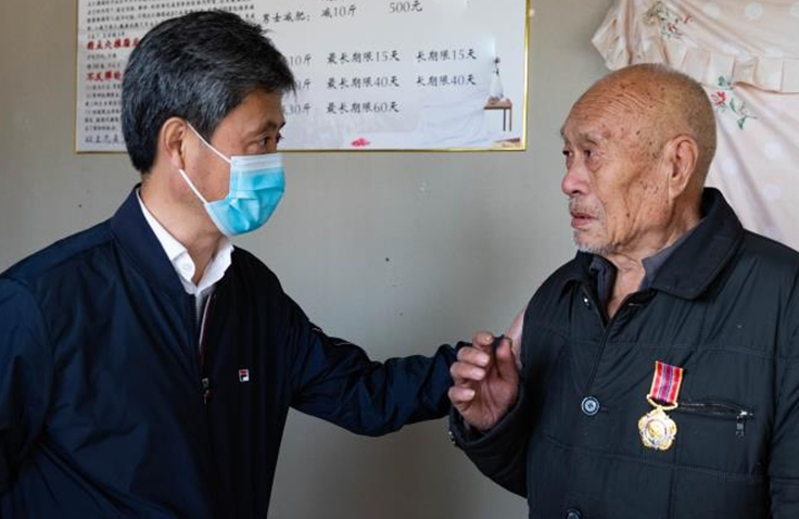 84歲的徐敏老人17歲應(yīng)征入伍,參加過抗美援朝戰(zhàn)役。他雖然年事已高,但仍然精神抖擻、聲音洪亮。高立春一行來到徐敏家中,與他親切交談,并送上米、面、油、牛奶等慰問品。高立春對老人投身抗美援朝、經(jīng)歷浴血奮戰(zhàn)的大無畏精神表示敬意,感謝他們?yōu)樾轮袊鞒龅呢暙I,并親自為他佩戴上“中國人民志愿軍抗美援朝出國作戰(zhàn)70周年”紀念章。同時,高立春還要求相關(guān)部門和工作人員要時刻關(guān)心、照顧好老人,及時主動地幫助老人解決生活困難,并叮囑老人有任何困難第一時間找退役軍人服務(wù)中心這個“娘家人”。