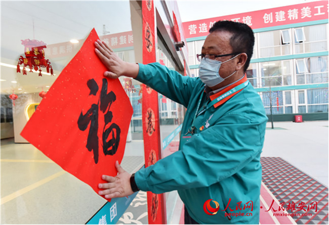 雄安新區(qū)容東片區(qū)B1組團(tuán)安置房項目留雄過年建設(shè)者貼福字。