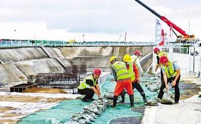 7月12日,施工人員在雄安新區(qū)啟動區(qū)放置沙袋。河北日報(bào)記者耿輝 攝
