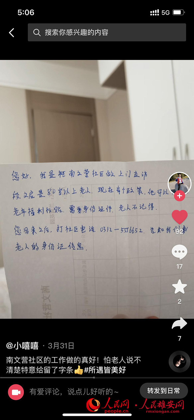 圖為老人家屬將社區(qū)人員留的紙條拍了短視頻發(fā)到網(wǎng)上,獲得一眾好評。容東管委會供圖