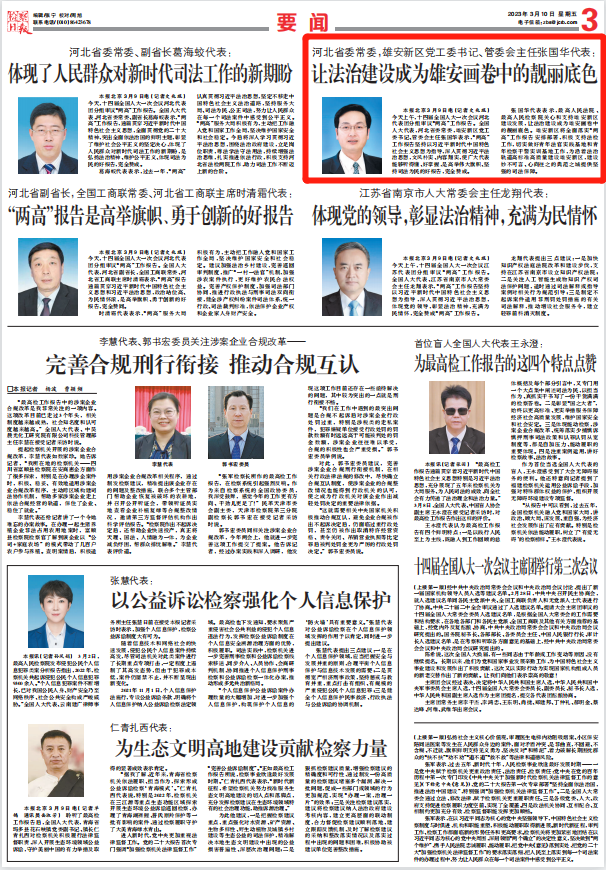 3月10日出版的《檢察日報(bào)》刊發(fā)了題為《河北省委常委,雄安新區(qū)黨工委書記、管委會主任張國華代表: 讓法治建設(shè)成為雄安畫卷中的靚麗底色 》的報(bào)道,一起來看↓↓↓