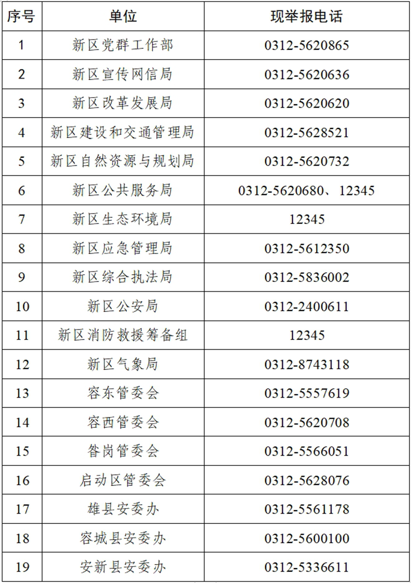 為認真貫徹落實《中華人民共和國安全生產(chǎn)法》《河北省安全生產(chǎn)條例》和《河北省安全生產(chǎn)舉報和獎勵辦法(試行)》等法律法規(guī)和文件規(guī)定,鼓勵企業(yè)內(nèi)部員工和廣大群眾舉報安全生產(chǎn)事故隱患和非法違法行為,進一步加強安全生產(chǎn)領域社會監(jiān)督,及時治理和消除各類安全隱患,現(xiàn)將雄安新區(qū)各單位的安全生產(chǎn)舉報電話公示如下: