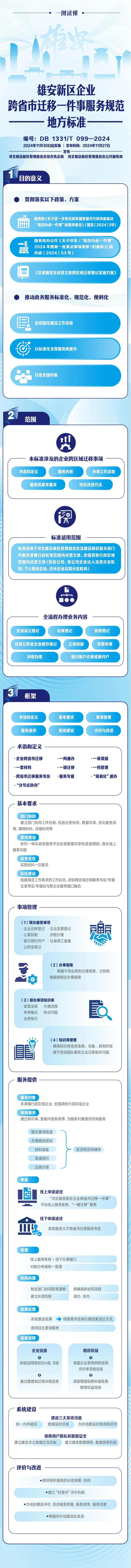 近日,《雄安新區(qū)企業(yè)跨省市遷移一件事服務(wù)規(guī)范》(以下簡(jiǎn)稱(chēng)《服務(wù)規(guī)范》)正式發(fā)布。作為指導(dǎo)京津冀及全國(guó)其他區(qū)域企業(yè)遷入雄安新區(qū)的推薦性地方標(biāo)準(zhǔn),其發(fā)布有助于進(jìn)一步提升雄安新區(qū)政務(wù)服務(wù)效能,推動(dòng)政務(wù)服務(wù)標(biāo)準(zhǔn)化、規(guī)范化、便利化,以服務(wù)型政府推動(dòng)構(gòu)建全國(guó)統(tǒng)一大市場(chǎng),推進(jìn)京津冀協(xié)同發(fā)展,打造企業(yè)遷移服務(wù)流程樣板。