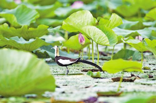 截至目前,白洋淀野生鳥(niǎo)類(lèi)增加至296種。圖為7月7日拍攝的水雉在白洋淀?xiàng)⒁捠?。河北日?qǐng)?bào)記者 劉光昱攝