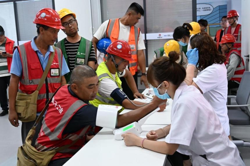 醫(yī)生志愿者為工友測(cè)量血壓。啟動(dòng)區(qū)管委會(huì)供圖