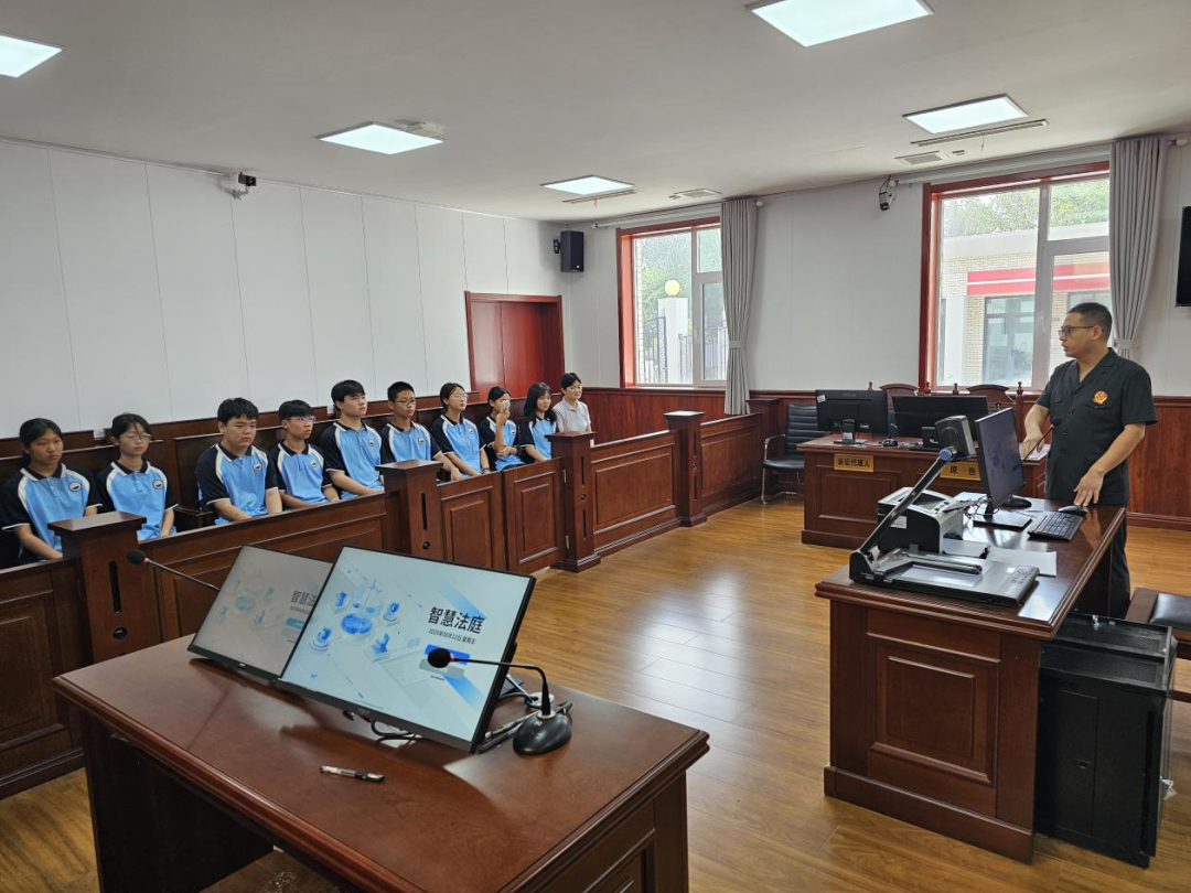 老師和學(xué)生們參觀了安檢室、信訪接待室、調(diào)解室、訴訟服務(wù)中心,負責(zé)人郭智輝介紹法庭黨建和審判融合工作開展情況,如何以“黨建紅”引領(lǐng)“法治藍”,以司法裁判為“盾”筑牢法律底線,老師和學(xué)生們對黨建和審判融合工作有了深入的了解。