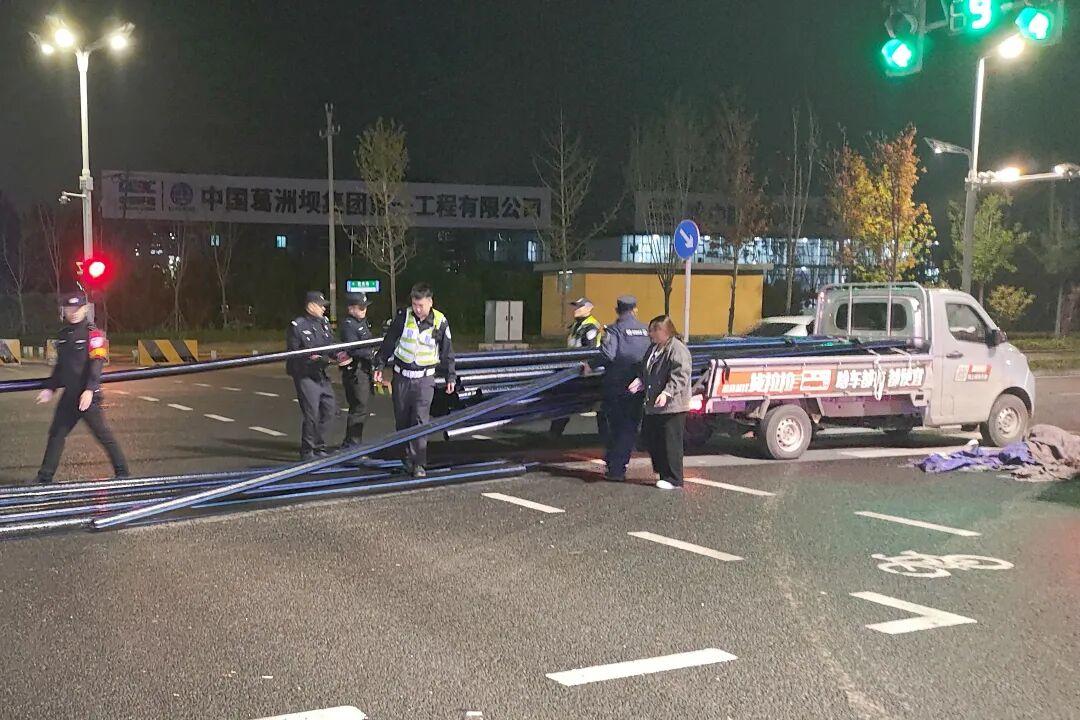吉海祥帶領(lǐng)執(zhí)勤隊(duì)員迅速行動,一組在來車方向擺放警示標(biāo)識,引導(dǎo)車輛緩慢繞行;一組幫助搬抬金屬管材,合力將其逐一裝回車上。經(jīng)過近20分鐘的緊張忙碌,所有散落管材均被重新裝載上車。