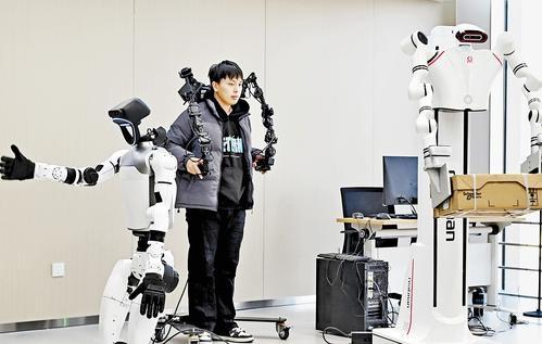 近日,在中國雄安集團數(shù)字城市科技有限公司的具身智能訓練場內,數(shù)據(jù)采集員正對異構機器人進行具身智能訓練。記者劉光昱 攝