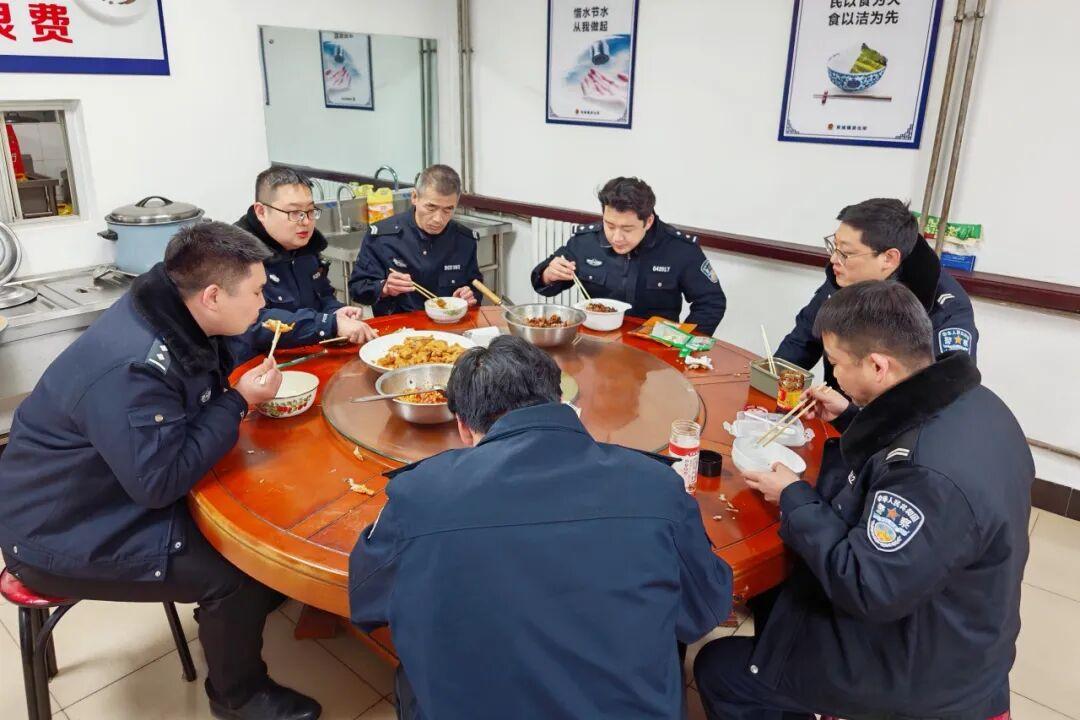 夜幕降臨,晚上七點(diǎn),走進(jìn)容城鎮(zhèn)派出所的食堂,值班民輔警圍坐一桌,滿室暖意。