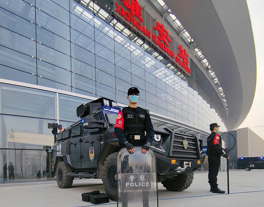 特警在雄安站廣場(chǎng)執(zhí)勤。雄安新區(qū)公安局供圖