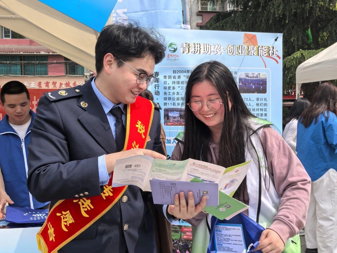 在活動(dòng)現(xiàn)場(chǎng),稅法宣傳志愿者穿梭于“青聽(tīng)心聲·鄰里會(huì)客廳”“青護(hù)家園·環(huán)保先鋒營(yíng)”“青耕助農(nóng)·創(chuàng)業(yè)聚能社”等展示區(qū),用通俗易懂的語(yǔ)言為“擺攤者”“趕集者”講解個(gè)人所得稅專(zhuān)項(xiàng)附加扣除、重點(diǎn)群體創(chuàng)業(yè)就業(yè)稅收優(yōu)惠、社保費(fèi)繳納流程等與群眾生活、經(jīng)營(yíng)息息相關(guān)的熱點(diǎn)稅收知識(shí)。此次活動(dòng)還設(shè)置了稅法咨詢(xún)臺(tái),為前來(lái)咨詢(xún)的商戶(hù)、青年提供“一對(duì)一”答疑服務(wù),并發(fā)放印有國(guó)家稅務(wù)總局微信公眾號(hào)二維碼的宣傳折頁(yè),方便青年群體掃碼獲取更多稅收知識(shí)。