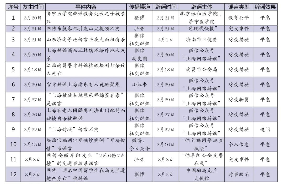 3月網(wǎng)絡(luò)涉法謠言辟謠榜單共梳理、匯總12起熱點(diǎn)事件,圍繞謠言持續(xù)時(shí)間、傳播渠道、產(chǎn)生地域、類型以及辟謠平臺(tái)等維度綜合分析,篩選兩起關(guān)注度較高、具有典型意義的案例研判,以期為網(wǎng)絡(luò)辟謠工作提供參考借鑒。