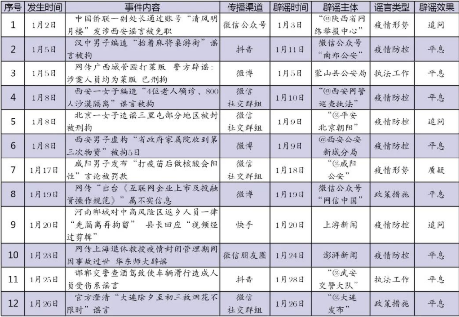 1月網(wǎng)絡(luò)涉法謠言辟謠榜單共梳理、匯總12起熱點(diǎn)事件,圍繞謠言持續(xù)時(shí)間、傳播渠道、產(chǎn)生地域、類型以及辟謠平臺(tái)等維度綜合分析,并篩選兩起關(guān)注度較高、具有典型意義的案例研判,以期為網(wǎng)絡(luò)辟謠工作提供參考借鑒。