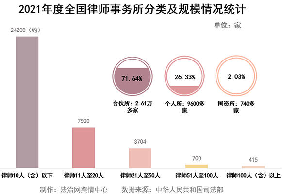 從律所規(guī)模上看,“10人及以下”律所最多,達2.42萬家,“11人至20人”律所次之,達7500家?!?00人及以上”的大型律所共有415家。