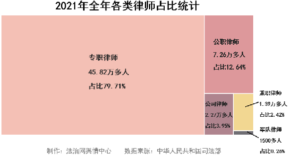律師隊伍中,大體分為五類:專職律師、公職律師、公司律師、兼職律師、軍隊律師。截至2021年底,專職律師占比最高,達79.71%。公職律師、公司律師、兼職律師、軍隊律師分別占比12.64%、3.95%、2.42%和0.26%。