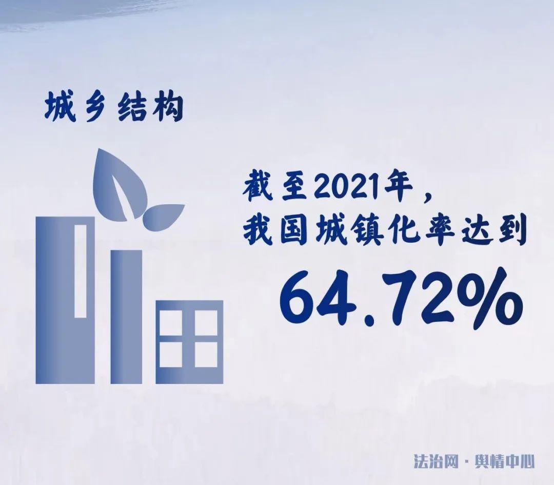 從城鄉(xiāng)結(jié)構(gòu)來看,1982年,我國是一個農(nóng)村人口占總?cè)丝?0%的典型農(nóng)業(yè)型國家。此后,通過不斷健全各項制度,多舉措改革創(chuàng)新,提高社會流動性,使得中國社會走上了城市化發(fā)展道路,城市活力得到了進一步釋放。我國實現(xiàn)了從落后的鄉(xiāng)村型社會向富足的城鄉(xiāng)融合型社會轉(zhuǎn)變。截至2021年,我國城鎮(zhèn)化率達到了64.72%。