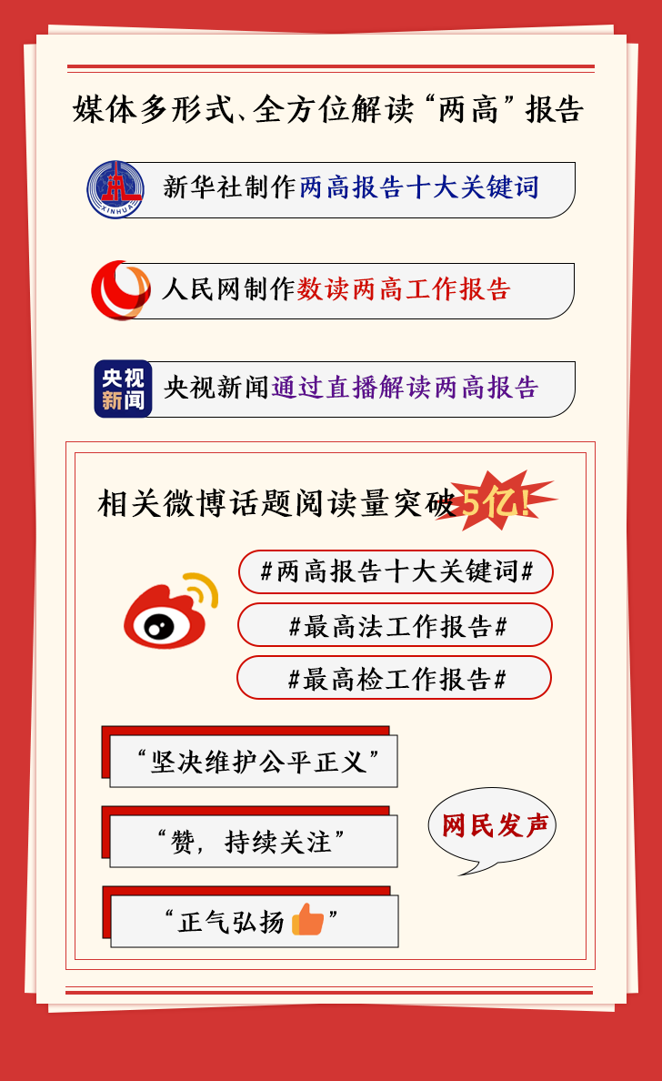 新華社制作長圖整理“兩高”報告亮點內(nèi)容;人民網(wǎng)用數(shù)據(jù)解讀“兩高”報告;“@央視新聞”則通過直播幫助公眾快速了解報告詮釋的法治精神。“兩高”報告相關(guān)話題獲得網(wǎng)民廣泛關(guān)注,截至3月8日8時,“#兩高報告十大關(guān)鍵詞#”等微博話題閱讀量累計超5億。