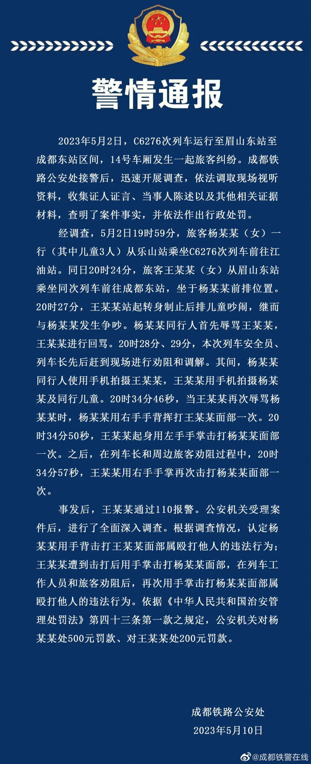 面對網(wǎng)絡(luò)質(zhì)疑,5月10日,成都鐵路公安處官方微博“@成都鐵警在線”發(fā)布警情通報稱,根據(jù)調(diào)查情況,認定楊某某用手背擊打王某某面部屬毆打他人的違法行為;王某某遭到擊打后用手掌擊打楊某某面部,在列車工作人員和旅客勸阻后,再次用手掌擊打楊某某面部屬毆打他人的違法行為。警方據(jù)此認為雙方均違反治安管理處罰法,并處以不同金額的罰款。隨后,四川廣播電視臺“@四川觀察”、封面新聞公布現(xiàn)場視頻,涉及列車車廂監(jiān)控、列車長巡檢記錄儀、當(dāng)事雙方手機所拍視頻等多個角度,直觀地呈現(xiàn)雙方發(fā)生爭執(zhí)繼而爆發(fā)肢體沖突的過程。網(wǎng)絡(luò)討論熱度再次攀升,微博上形成“#高鐵掌摑事件雙方曾多次對罵#”“#高鐵被打女子2次打人被認定違法#”“#王某某被打后兩次掌摑楊某某#”等多個話題,不少網(wǎng)民一改之前支持王某某的立場。但部分網(wǎng)民仍從情感角度出發(fā),質(zhì)疑官方對視頻進行二次剪輯,認為警方苛求被打者還擊的間隔時間有失公平。
