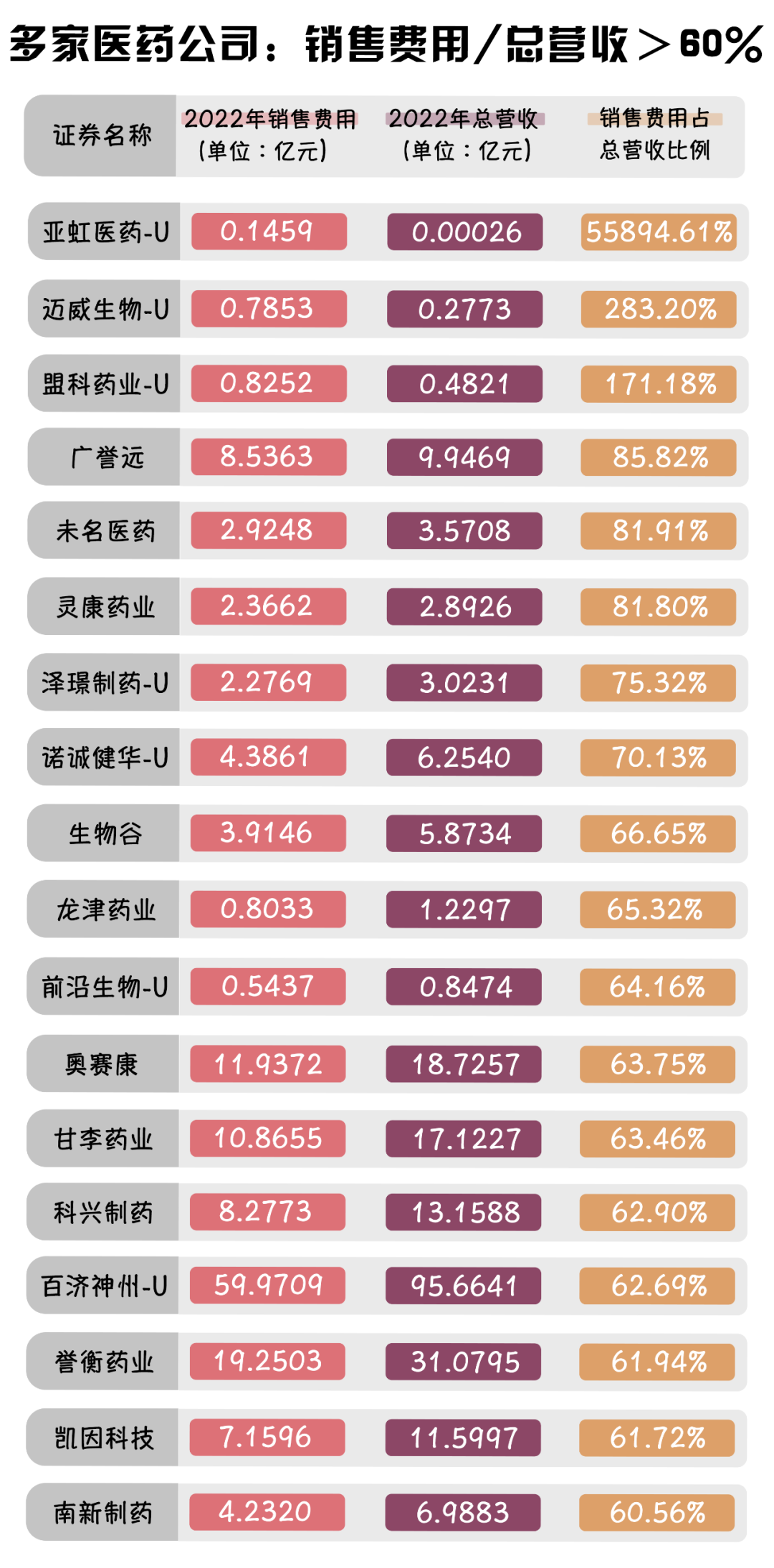 根據(jù)wind發(fā)布的數(shù)據(jù)顯示,從各藥企銷售費(fèi)用占總營(yíng)收比例來(lái)看,截至2022年底,共18家藥企的銷售費(fèi)用占總營(yíng)收比例超過(guò)60%,其中亞虹醫(yī)藥-U、邁威生物-U以及盟科藥業(yè)-U這三家藥企的銷售費(fèi)用占總營(yíng)收比例均超過(guò)了100%。