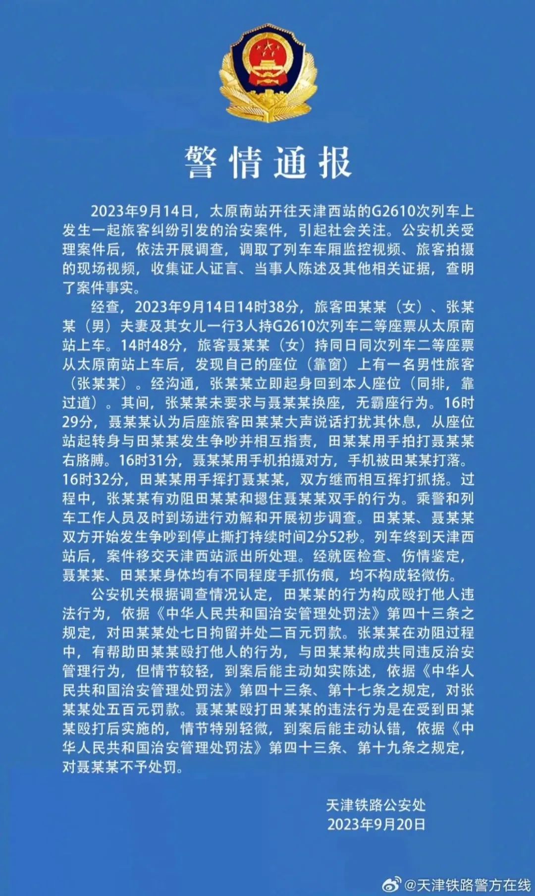 數(shù)日后,事件迎來動態(tài)進展。9月20日,天津鐵路公安處再次發(fā)布詳細通報,還原了事發(fā)過程,表示雙方矛盾系因口角糾紛引發(fā),不存在霸座行為,雙方均不構(gòu)成輕微傷,田某某有毆打他人違法行為,將其拘留七日并罰款200元,張某某勸阻過程中幫助田某某毆打他人,被處以500元罰款,聶某某的毆打行為是在受到田某某毆打后實施的,因情節(jié)特別輕微且主動認錯不予處罰。網(wǎng)民認可通報內(nèi)容,稱“原來如此”,贊官方處理得當(dāng)。