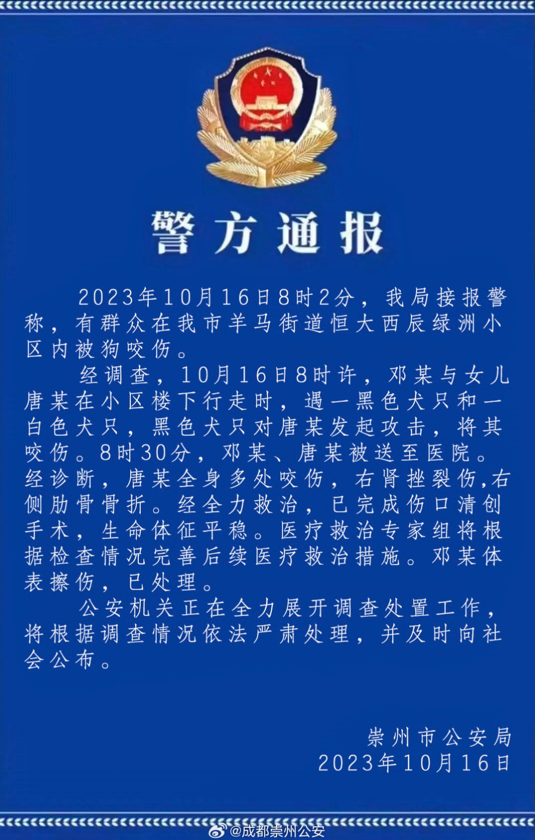 事發(fā)當(dāng)日17時許,崇州公安發(fā)布首份通報,稱被咬女童生命體征平穩(wěn),正全力展開調(diào)查處置工作。輿論場中不少網(wǎng)民探究事發(fā)原因,認為養(yǎng)犬規(guī)定落實不到位,導(dǎo)致遛狗不牽繩、飼養(yǎng)烈性犬等亂象出現(xiàn)。10月17日,據(jù)受傷女童母親透露,涉事黑犬已被找到,警方還在排查狗主人。另有媒體報道稱,成都禁養(yǎng)22種烈性犬不包括羅威納,部分網(wǎng)民對警方工作效率表達不滿情緒。