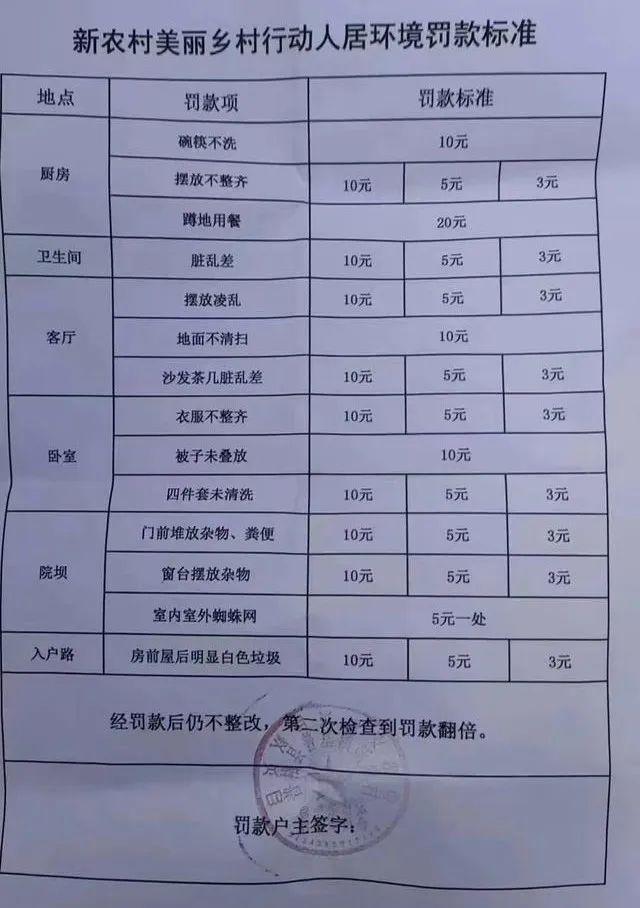 據(jù)央廣網(wǎng)報(bào)道,《罰款標(biāo)準(zhǔn)》共涉及14條人居環(huán)境罰款標(biāo)準(zhǔn),罰款項(xiàng)包括碗筷不洗、蹲地用餐、衛(wèi)生間臟亂差、被子未疊、臥室四件套未清洗等,罰款金額從3元到20元不等。該村黨支部書記回應(yīng)稱,該標(biāo)準(zhǔn)是為了糾正懶散村民的行為,還沒(méi)正式開(kāi)始實(shí)施,仍在宣傳階段。當(dāng)?shù)卮迕裎瘑T會(huì)以罰代管一事引發(fā)輿論廣泛關(guān)注。