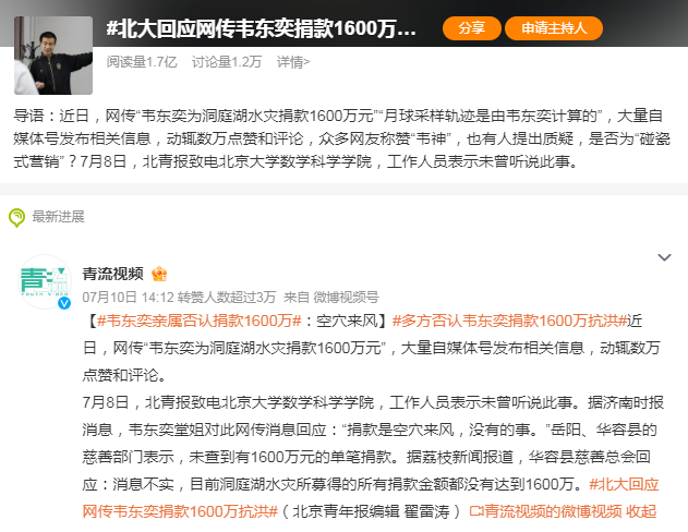三是捏造救援救助信息。災(zāi)害發(fā)生后,物資調(diào)撥、人員搜救、群眾轉(zhuǎn)移等搶險救援情況被主流媒體持續(xù)報道,吸引輿論廣泛關(guān)注,相關(guān)謠言趁機(jī)流竄,成為傳播主旋律中的雜音。如抖音網(wǎng)民“賓利xx”發(fā)視頻謊稱,河南南陽市臥龍區(qū)陸營鎮(zhèn)王莊村被水淹,臥龍區(qū)使用直升機(jī)進(jìn)行救援。經(jīng)核實,“直升機(jī)救援”一說系虛假信息。網(wǎng)傳“韋東奕(韋神)為洞庭湖水災(zāi)捐款1600萬元”消息引發(fā)關(guān)注,多個相關(guān)視頻獲得數(shù)萬點贊。事后,韋東奕親屬回應(yīng)稱系“假消息”,湖南岳陽市和華容縣慈善部門也表示,未查到有1600萬元的單筆捐款。自媒體這種無底線的“碰瓷式營銷”激起輿論公憤,《新華每日電訊》發(fā)文稱,世上沒有所謂的“正能量謠言”,旗幟鮮明地打擊各類謠言,鏟除造謠傳謠的土壤,才是真正的正能量?!侗本┩韴蟆房脑u論稱,給“韋神”貼金是假,靠造謠撈金是真,任短視頻謠言隔三岔五污染視聽,會對整個社會信任體系造成沖擊。