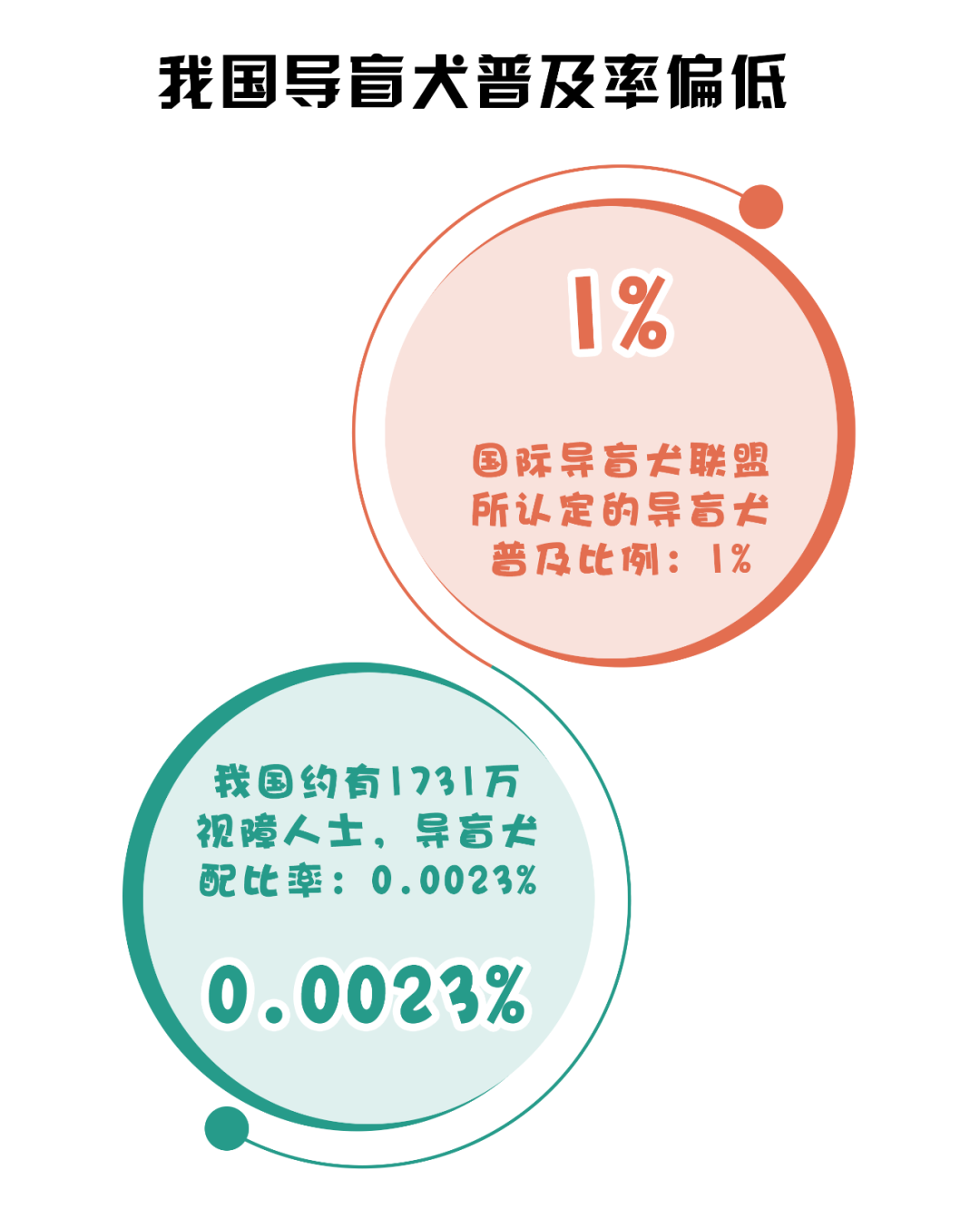 按照國際導盲犬聯盟標準規(guī)定,當一個國家導盲犬使用者達到視障人群比例的1%以上時,方可認定該國實現導盲犬普及。我國視障人士數量約為1731萬,導盲犬普及率僅為0.0023%,與國際標準相去甚遠。