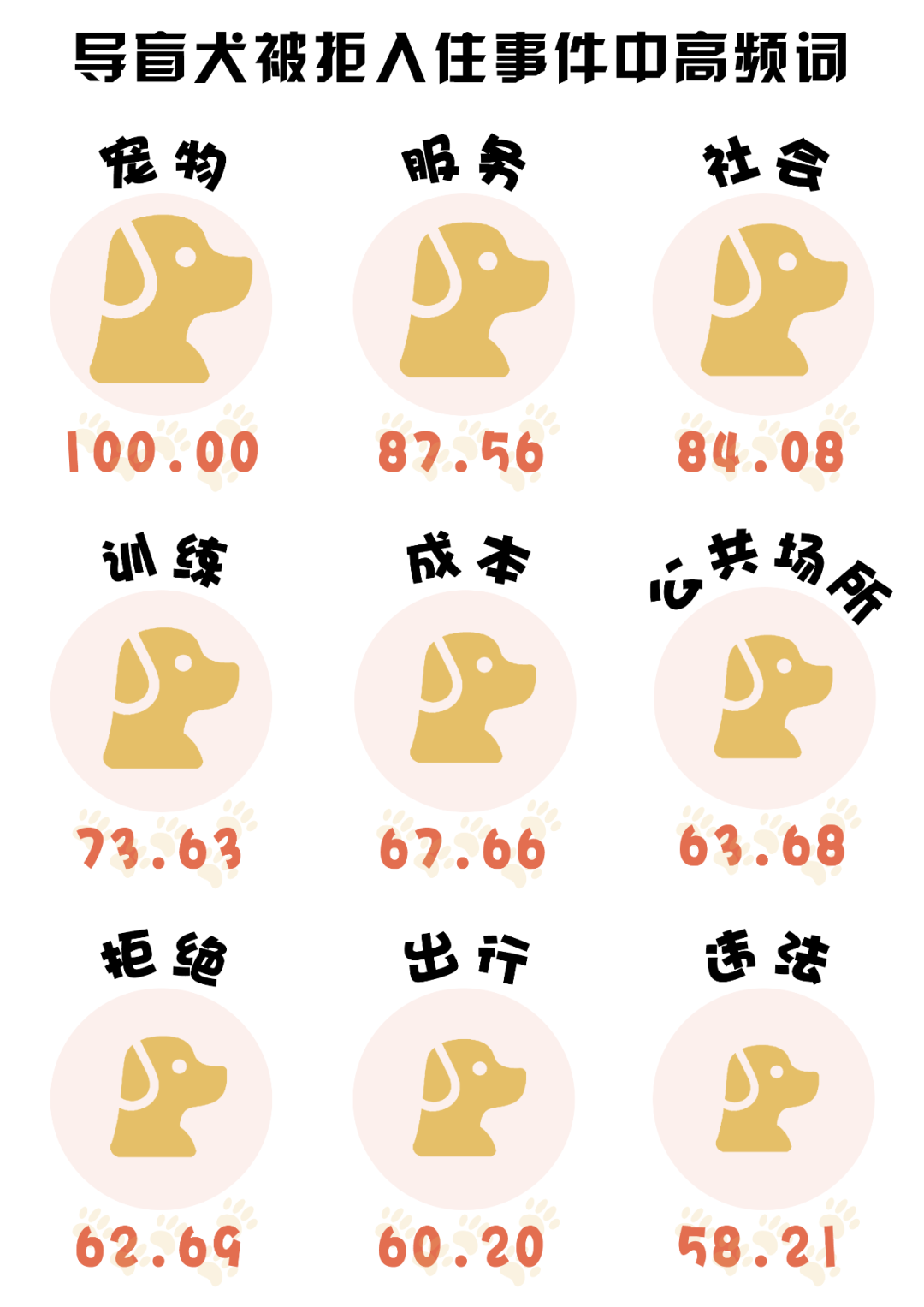 (數據來源:選取嗶哩嗶哩視頻《炒作、稀缺、奢侈品?為什么導盲犬被噴成了一場騙局?》下的6949條一級評論及彈幕,做分詞及歸一化處理,進行分詞后將熱度最高的詞語規(guī)定為100)