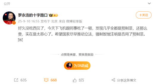 回溯這場(chǎng)討論的源頭,始于羅永浩的一篇微博。9月10日下午,“@羅永浩的十字路口”發(fā)博稱(chēng),“好久沒(méi)吃西貝了,今天下飛機(jī)跟同事吃了一頓發(fā)現(xiàn)幾乎全都是預(yù)制菜,還那么貴,實(shí)在是太惡心了。希望國(guó)家盡早推動(dòng)立法,強(qiáng)制飯館注明是否用了預(yù)制菜?!碧陌l(fā)出后迅速引起網(wǎng)民關(guān)注。