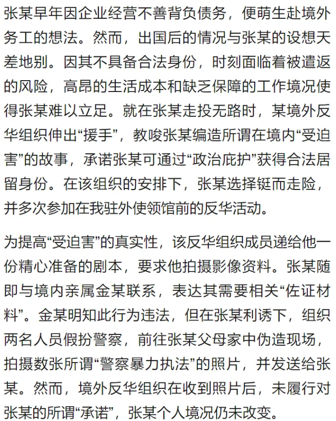 4. “境外反華組織教唆擺拍暴力執(zhí)法” 案。8月14日,國家安全部公布一起標(biāo)題為《跨境賣慘終成空》的案例。據(jù)悉,張某國內(nèi)企業(yè)經(jīng)營不善負(fù)債,赴境外務(wù)工后因無合法身份面臨遣返風(fēng)險(xiǎn)。境外反華組織以“政治庇護(hù)換取居留身份”為誘餌,提供詳細(xì)拍攝劇本,還提出“畫面暴力血腥”“效果要慘”“抓拍增強(qiáng)真實(shí)感”等要求。在反華組織教唆下,張某聯(lián)系到親屬金某,金某明知此行為違法,但在張某利誘下組織兩名人員假扮警察,前往張某父母家中偽造現(xiàn)場,拍攝數(shù)張所謂“警察暴力執(zhí)法”的照片,并將材料發(fā)送境外,但境外反華組織在收到照片后未履行對張某的所謂“承諾”。該案最終被國家安全機(jī)關(guān)破獲。央視網(wǎng)、微信公眾號“俠客島”等轉(zhuǎn)發(fā)相關(guān)內(nèi)容。輿論將此案稱為一場“政治避難”鬧劇,指出“因一己之利參加境外反華活動(dòng),為反華勢力提供煽宣‘彈藥’,但最終竹籃打水一場空”。