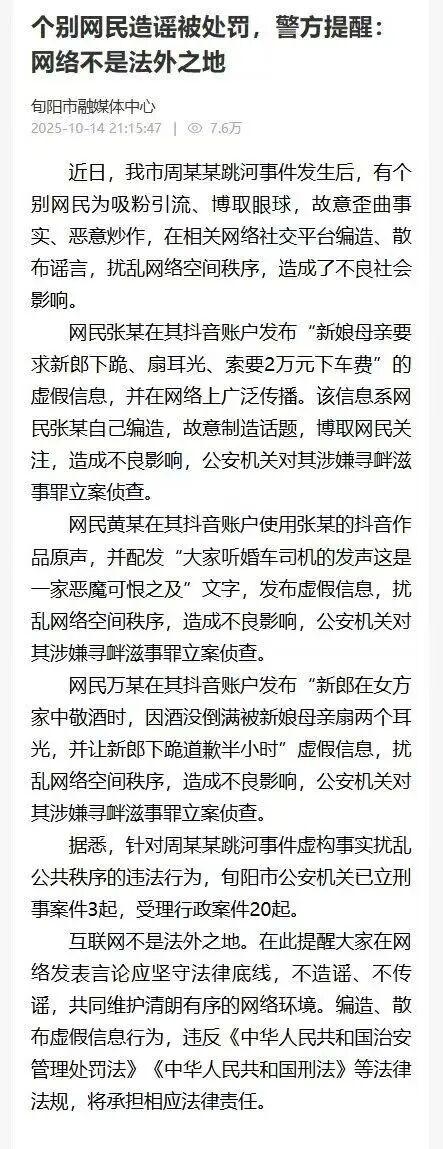 同日,陜西安康旬陽市融媒體中心發(fā)布消息稱,近日,旬陽市周某某跳河事件發(fā)生后,有個(gè)別網(wǎng)民為吸粉引流、博取眼球,故意歪曲事實(shí)、惡意炒作,在相關(guān)網(wǎng)絡(luò)社交平臺(tái)編造、散布謠言,擾亂網(wǎng)絡(luò)空間秩序,造成了不良社會(huì)影響。網(wǎng)民張某、黃某、萬某在短視頻賬戶發(fā)布相關(guān)虛假信息,造成不良影響,已被公安機(jī)關(guān)以涉嫌尋釁滋事罪立案?jìng)刹椤a槍?duì)周某某跳河事件虛構(gòu)事實(shí)擾亂公共秩序的違法行為,旬陽市公安機(jī)關(guān)已立刑事案件3起,受理行政案件20起。輿論普遍表示,官方展現(xiàn)了治理謠言的決心,認(rèn)為制止謠言最好的方法就是公布調(diào)查結(jié)果。