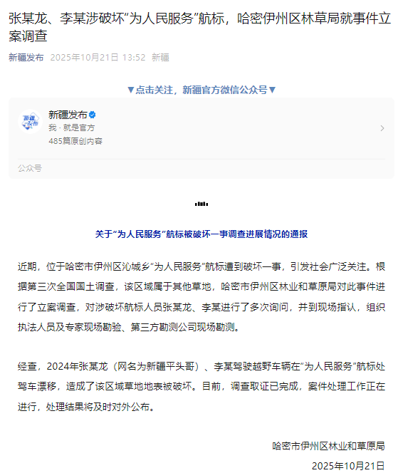 10月21日,新疆維吾爾自治區(qū)新聞辦公室官方微信號(hào)“新疆發(fā)布”發(fā)布通報(bào),稱(chēng)哈密市伊州區(qū)林業(yè)和草原局對(duì)此事件進(jìn)行了立案調(diào)查,對(duì)涉破壞航標(biāo)人員張某龍(網(wǎng)名為“新疆平頭哥”)、李某進(jìn)行了多次詢(xún)問(wèn),并到現(xiàn)場(chǎng)指認(rèn)處理結(jié)果將及時(shí)對(duì)外公布。人民日?qǐng)?bào)、澎湃新聞、紅星新聞等轉(zhuǎn)發(fā)了通報(bào)內(nèi)容,輿情有所回溫。
