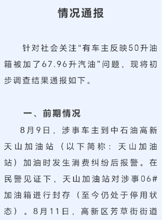 據(jù)澎湃新聞8月20日?qǐng)?bào)道,8月9日,車(chē)主楊某駕駛油箱總?cè)萘?0升的小車(chē),在成都市中石油錦華天山站加油,油箱顯示為其加注了67.96升汽油。楊某提出異議后,加油站表示只認(rèn)油槍數(shù)據(jù),堅(jiān)持按67.96升收費(fèi),楊某最終結(jié)賬離開(kāi)。結(jié)賬離開(kāi)前,楊某先后向公安機(jī)關(guān)、市監(jiān)局、12345熱線等多部門(mén)投訴,并要求加油站封槍。三天后,加油站一負(fù)責(zé)人以私人名義將多收的錢(qián)退給楊某,希望其同意油槍解封,但解封后加油站沒(méi)有給出過(guò)任何解釋。在“問(wèn)政四川”平臺(tái)上,成都市高新區(qū)管委會(huì)回復(fù)“將在15個(gè)工作日詳細(xì)回復(fù)”;高新區(qū)市場(chǎng)監(jiān)督管理局綜合執(zhí)法部門(mén)工作人員表示,有了進(jìn)展辦案人員會(huì)聯(lián)系投訴人。部分自媒體和網(wǎng)民圍繞事件原因進(jìn)行討論,要求官方給出一個(gè)透明、準(zhǔn)確的調(diào)查結(jié)果。深圳廣電集團(tuán)都市頻道“@第一現(xiàn)場(chǎng)”還評(píng)論稱,“監(jiān)管部門(mén)不應(yīng)沉默”。