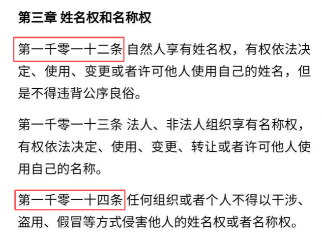 《中華人民共和國(guó)民法典》第一千零一十二條、第一千零一十四條規(guī)定,自然人享有姓名權(quán),有權(quán)依法決定、使用、變更或者許可他人使用自己的姓名,但是不得違背公序良俗。任何組織或者個(gè)人不得以干涉、盜用、假冒等方式侵害他人的姓名權(quán)或者名稱權(quán)。