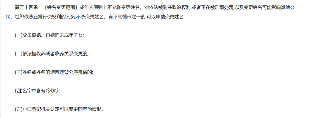 四川省曾經(jīng)出臺(tái)了《全省公安機(jī)關(guān)戶政管理工作規(guī)程(試行)》。其中,第五十四條規(guī)定,成年人原則上不允許變更姓名。有下列情形之一的,可以申請(qǐng)變更姓名:(一)父母離婚、再婚的未成年子女;(二)依法被收養(yǎng)或者收養(yǎng)關(guān)系變更的;(三)姓名或姓名的諧音違背公序良俗的;(四)名字中含有冷僻字;(五)戶口登記機(jī)關(guān)認(rèn)定可以變更的其他情形。