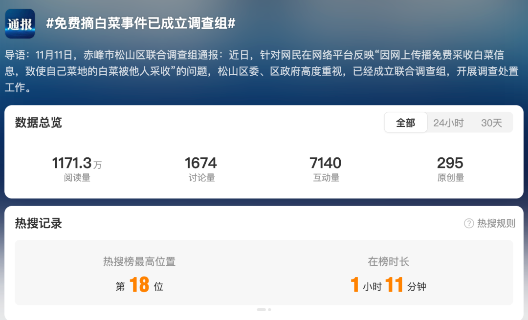 11月11日,赤峰市松山區(qū)聯(lián)合調(diào)查組發(fā)布情況通報(bào)稱,針對(duì)網(wǎng)民在網(wǎng)絡(luò)平臺(tái)反映“因網(wǎng)上傳播免費(fèi)采收白菜信息,致使自己菜地的白菜被他人采收”的問題,松山區(qū)委、區(qū)政府高度重視,已經(jīng)成立聯(lián)合調(diào)查組,開展調(diào)查處置工作。后續(xù)情況將及時(shí)向社會(huì)發(fā)布。微博話題“#免費(fèi)摘白菜事件已成立調(diào)查組#”“#官方通報(bào)白菜免費(fèi)摘事件#”再次登上熱搜榜,輿論肯定官方積極介入調(diào)查,并對(duì)最終調(diào)查結(jié)果表示關(guān)注。