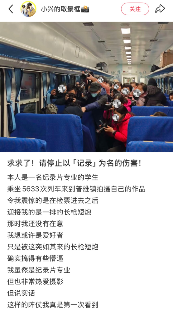 11月19日20時許,小紅書網(wǎng)民“@小興的取景框”發(fā)帖稱,自己在乘坐5633次列車前往普雄鎮(zhèn)的途中,在車廂內(nèi)遇到一攝影團(tuán)手持“長槍短炮”不停走動,并不顧被拍攝者意愿圍著一個人拍攝,呼吁停止以“記錄”為名的傷害,不少網(wǎng)民留言認(rèn)為這是冒犯被拍攝者的“鏡頭霸凌”行為。
