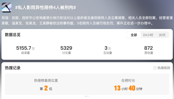 截至12月24日17時(shí),全網(wǎng)相關(guān)信息2.7萬(wàn)余條?!?私人影院強(qiáng)制要求顧客選擇異性陪侍套餐#”“#私人影院異性陪侍4人被刑拘#”“#成都涉黃私人影院已被關(guān)停#”“#涉黃私人影院3名00后女員工被罰#” 等微博話(huà)題閱讀量累計(jì)超1.6億。
