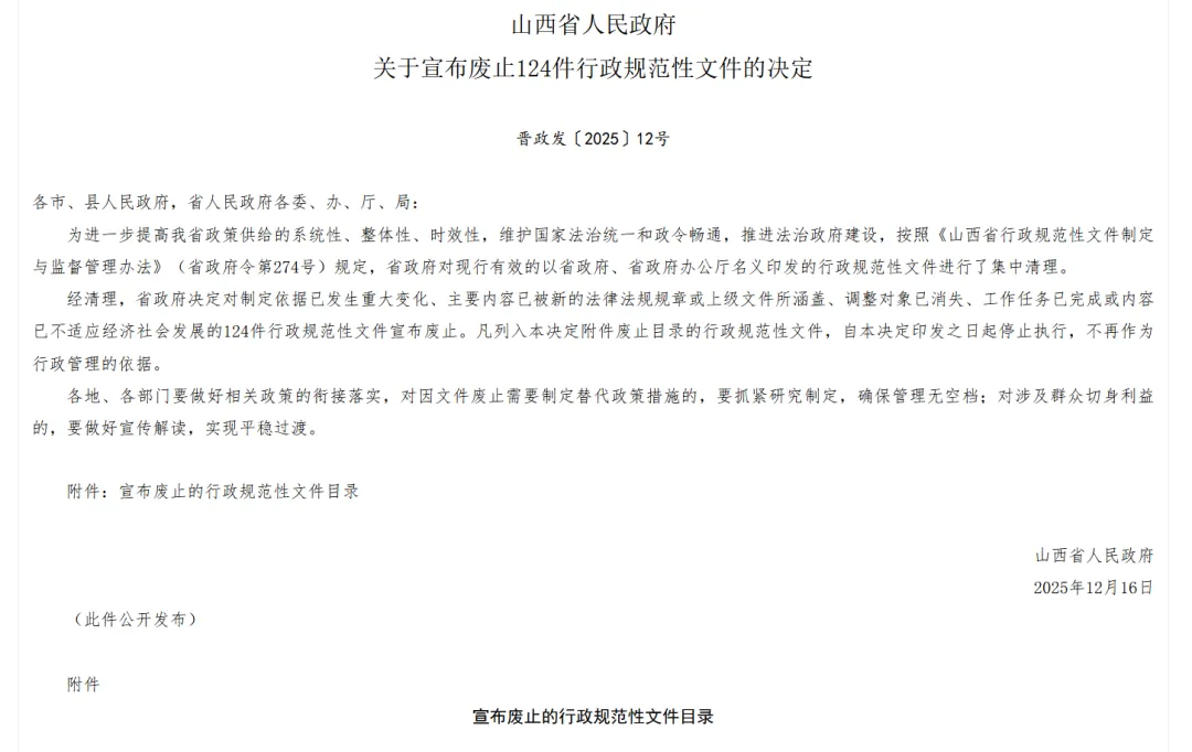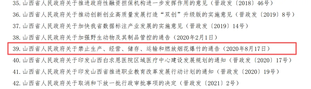 12月16日,《山西省人民政府關于宣布廢止124件行政規(guī)范性文件的決定》公布,其中,2020年8月17日發(fā)布、同年10月1日起正式實施的《山西省人民政府關于禁止生產、經營、儲存、運輸和燃放煙花爆竹的通告》被納入廢止目錄,該通告自12月16日起停止執(zhí)行,不再作為行政管理依據(jù)。