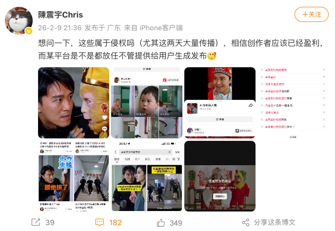 2月9日,周星馳經紀人“@陳震宇Chris”發(fā)現(xiàn)近期某短視頻平臺上AI生成的周星馳經典電影片段被大量傳播,并在微博上發(fā)問:“這些屬于侵權嗎?創(chuàng)作者可能已經借此盈利,平臺是否放任不管?”相關言論迅速在網絡引發(fā)熱議,將“AI魔改”視頻再次推上輿論風口浪尖。