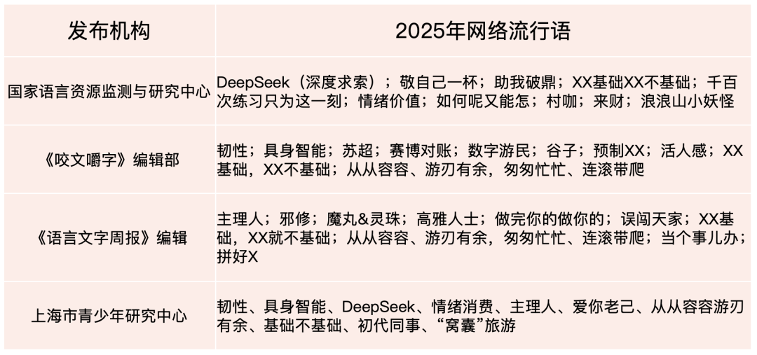 2025年12月,國家語言資源監(jiān)測與研究中心、《咬文嚼字》編輯部及《語言文字周報》編輯部相繼發(fā)布年度網(wǎng)絡流行語榜單。12月25日,上海市青少年研究中心立足青年群體視角,推出了“2025年度青年十大熱詞”。這些入選的流行語涵蓋科技、文化、消費等多個領域,其中“韌性”“DeepSeek”“具身智能”“從從容容游刃有余”等詞匯更是出現(xiàn)在不同機構(gòu)的榜單上,呈現(xiàn)出高度重合性。它們不僅構(gòu)成了一部由全民共同書寫的“情緒備忘錄”,也折射出當前傳播格局的演變與社會價值觀念的變遷。法治網(wǎng)輿情中心從使用主體、社會心態(tài)、傳播邏輯、行為趨向四個維度,對2025年網(wǎng)絡流行語展開深入解讀。