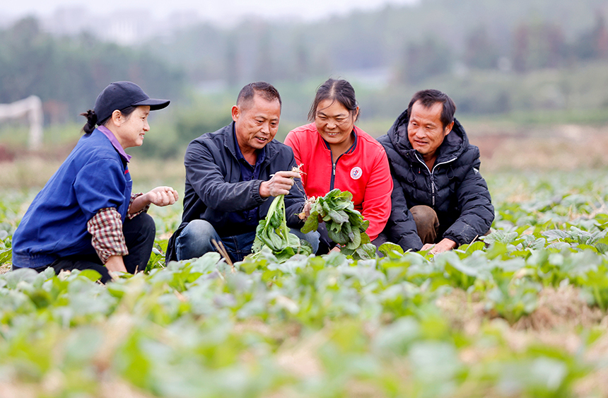 致富帶頭人何力(左二)在向村民傳授蔬菜種植技術(shù)。