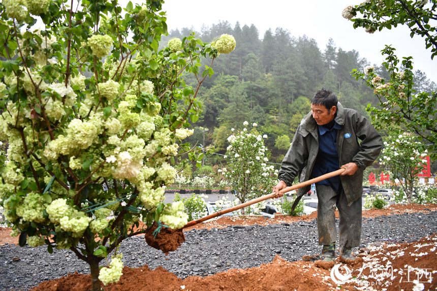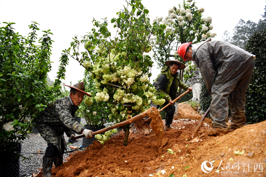 博覽園內(nèi),村民們正在栽種木繡球樹。時(shí)雨 攝
