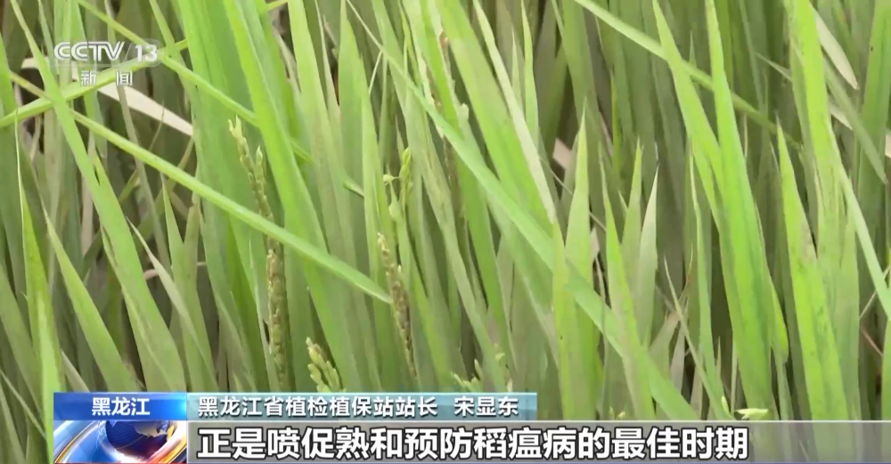 黑龍江省植檢植保站站長(zhǎng)宋顯東:像這塊地迫切需要促熟了,正是噴促熟和預(yù)防稻瘟病的最佳時(shí)期。上面這幾個(gè)功能葉還相當(dāng)不錯(cuò),因?yàn)樗井a(chǎn)量形成最重要的還是上面那三四個(gè)葉。