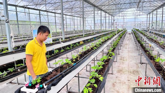 楊廣鋒在育苗大棚查看幼苗生長狀況(臺山市農(nóng)業(yè)農(nóng)村局供圖)